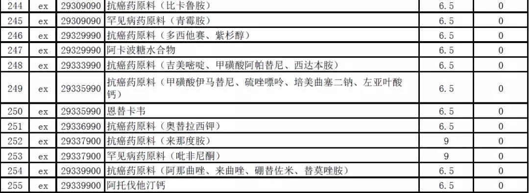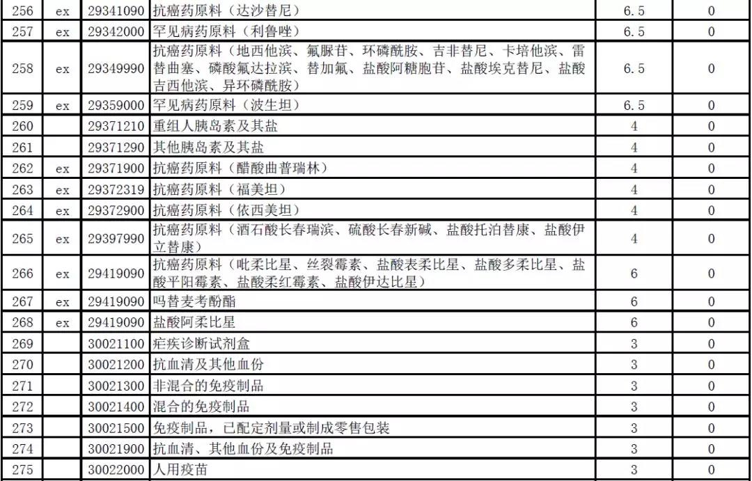 值得注意的是,在706項進(jìn)口暫定稅率調整商品中,地西他濱、奧替拉西鉀、來(lái)那度胺等多種抗癌藥原料和青霉胺、吡非尼酮、利魯唑、波生坦等多種罕見(jiàn)病藥原料將實(shí)施零關(guān)稅。此外,即將實(shí)施零關(guān)稅的藥品還包括了胰島素、免疫制品、抗血清及其他血份、人用疫苗、遺傳物質(zhì)和基因修飾生物體、具有抗癌作用的含有生物堿及其衍生物的藥品等。